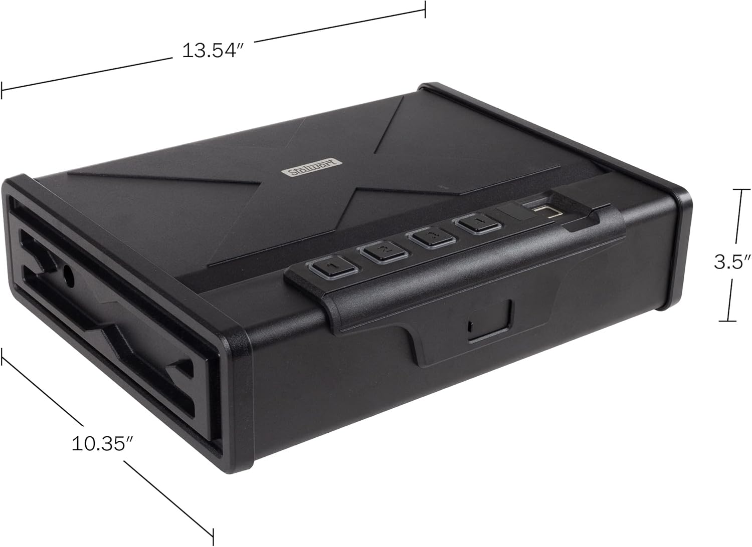 - Product Details: Materials: Heavy-duty 14-gauge carbon steel. Dimensions: 10.35 inches long x 3.5 inches wide x 13.54 inches high. Biometric gun safe with capacity for up to two handguns. Includes two backup override keys.
