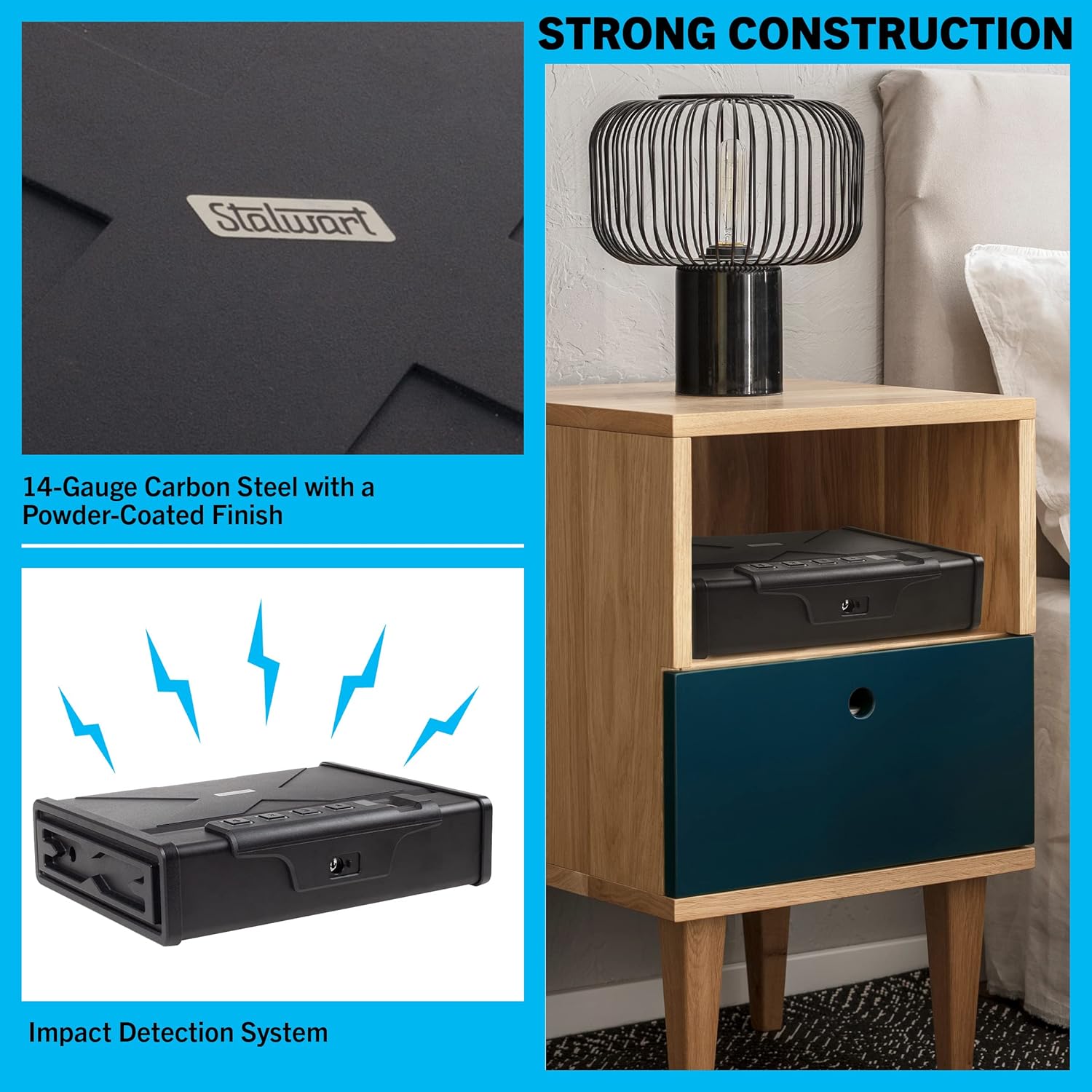 - Heavy-duty construction: This solid gun safe is constructed from powder-coated 14-gauge carbon steel with anti-pry bars, reinforced internal hinges and shock-resistant latches, as well as an impact detection system that sounds an alarm if it is bumped.