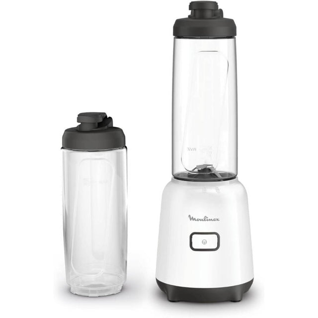 Offering perfect blending in a compact frame, the Moulinex Mix & Move Mini Blender offers exceptional blending on all your favorite smoothies, protein drinks and shakes—with two convenient to-go bottles for enjoying your fresh and delicious creations anywhere you like! The handy to-go bottles—in high-quality Tritan, with a 0.6 L capacity each—ensure the ideal format for taking your freshly blended creations on the move. Whether it's in your backyard, on the morning drive to work, or out for a jog, this blender for smoothies and shakes is perfect on the go. Mobility is matched by performance and ingenious features: A streamlined compact design for effortless storage, easy-cleaning removable blades, 300 W of power for smooth and creamy results in no time, and an ergonomic single-button control for perfect blending with total ease and comfort.