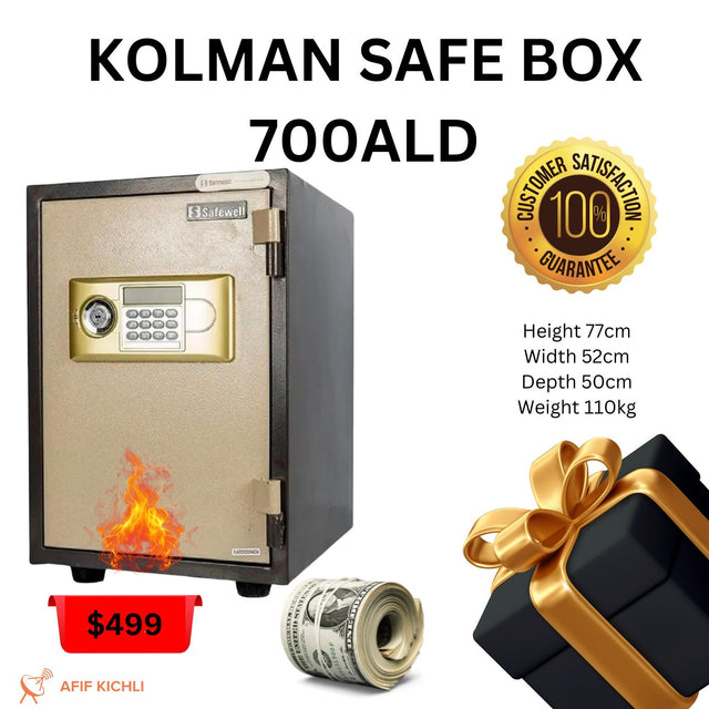 The KOLMAN 700ALH Electronic Fireproof Safe is designed for larger storage needs in offices, shops, and hotels. Constructed with a heavy-gauge steel body and door, this safe offers superior fire protection and security for your valuables. The keypad lock provides secure access, and the key override ensures you can always open the safe in case of emergency. With adjustable shelves and secure mounting options, it’s an excellent choice for both small and large items.